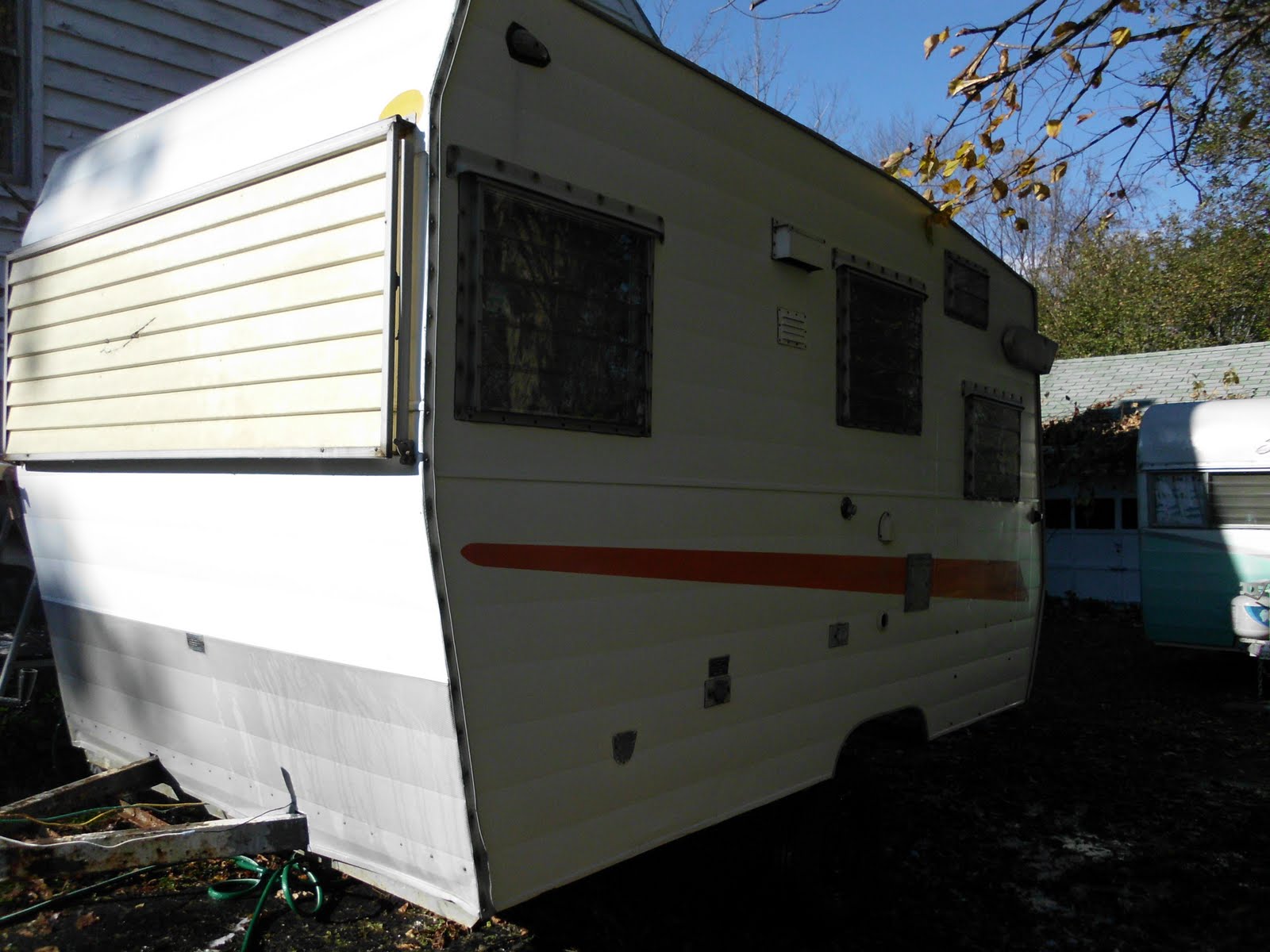 This trailer has so many stationary & flip-up covers on the driver's side that have no purpose any more. Since the interior is gutted, there isn't a need for city water hookups or a tank refill spout. There isn't a stove or propane lighting, hence no need for vents to air out trailer. Just lots of holes to nowhere. Thinking...